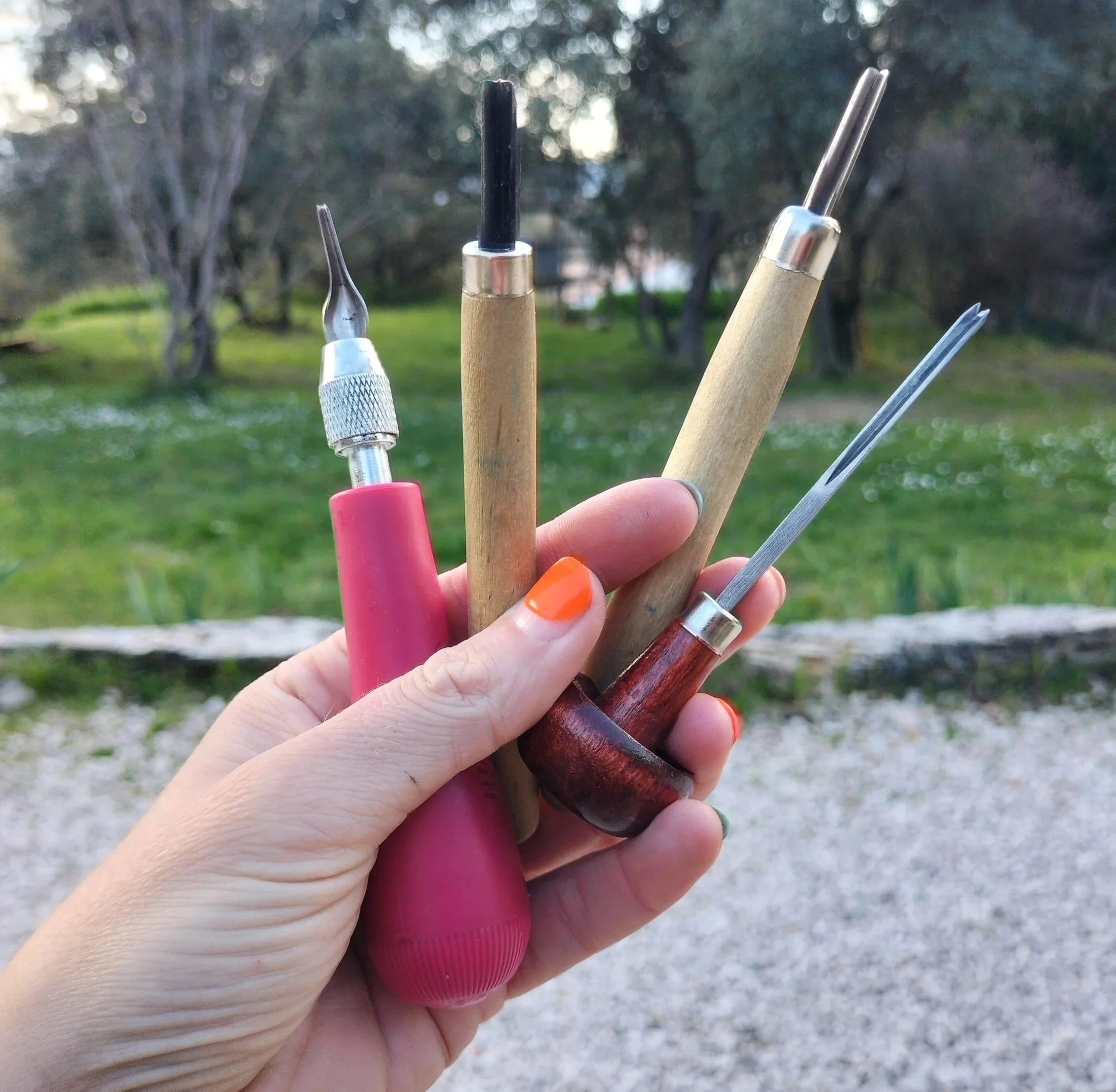 To carve your plates, you'll need carving tools or gouges. All the art shops listed previously would stock them. The good news is that you don't need to break the bank, and there are inexpensive, good-quality products available to get you started. In my studio, I have a collection of professional gouges, but I always find myself going back to my good old simple gouges, the ones I use for my classes. You can buy a set of 5 gouges from me at my studio or after my classes (€30). Alternatively, Speedball brand gouges are great and practical with their reservoir handles for storing the different carving bits.