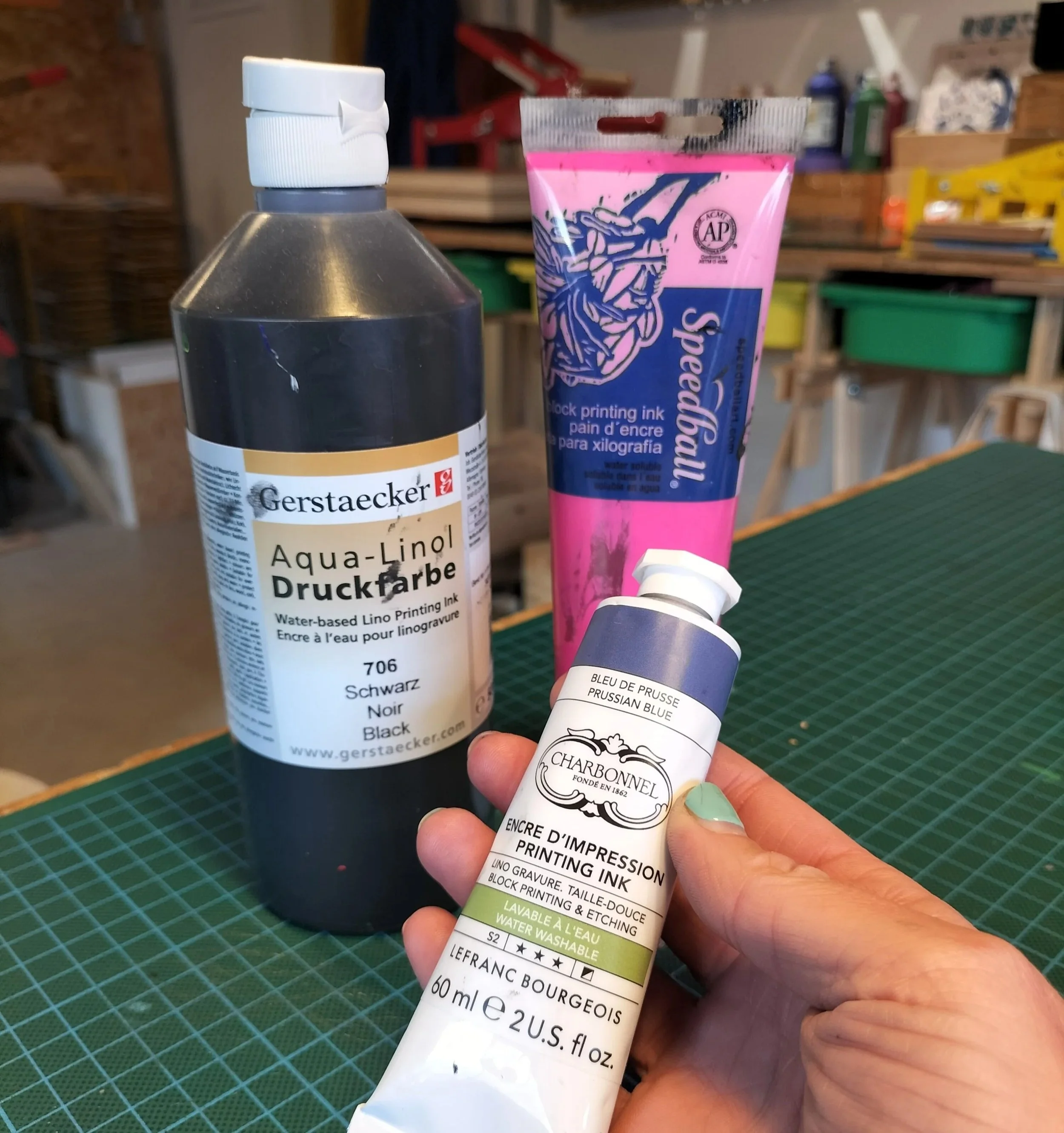 Unfortunately, it's difficult to substitute printmaking inks with paint, such as acrylic paint, for inking. Printmaking inks are indeed stickier and tackier than paint, and I recommend investing in a small tube of printmaking ink to get started. Always use water-based inks as a beginner and when working at home! Oil-based inks aren't really necessary for linocut and complicate the process and cleanup so much. The brands I recommend are Speedball inks (good, easy to find), Gerstaecker inks (very good texture. You’ll need to buy it online), and finally, my favourites, Schmincke or Cranfield inks, with their waterbased washable collection. You can find the speedball ones in most art shops and the Schmincke and Cranfield at Melbourne Artist Supplies and Melbourne Etching Supplies. I would avoid the Derivan brand, the ink is too liquid and you’ll get mucky prints. For milk carton printmaking, use the same type of ink. Simply start with a tube of your preferred brand in black, and you'll be able to create amazing results at home.