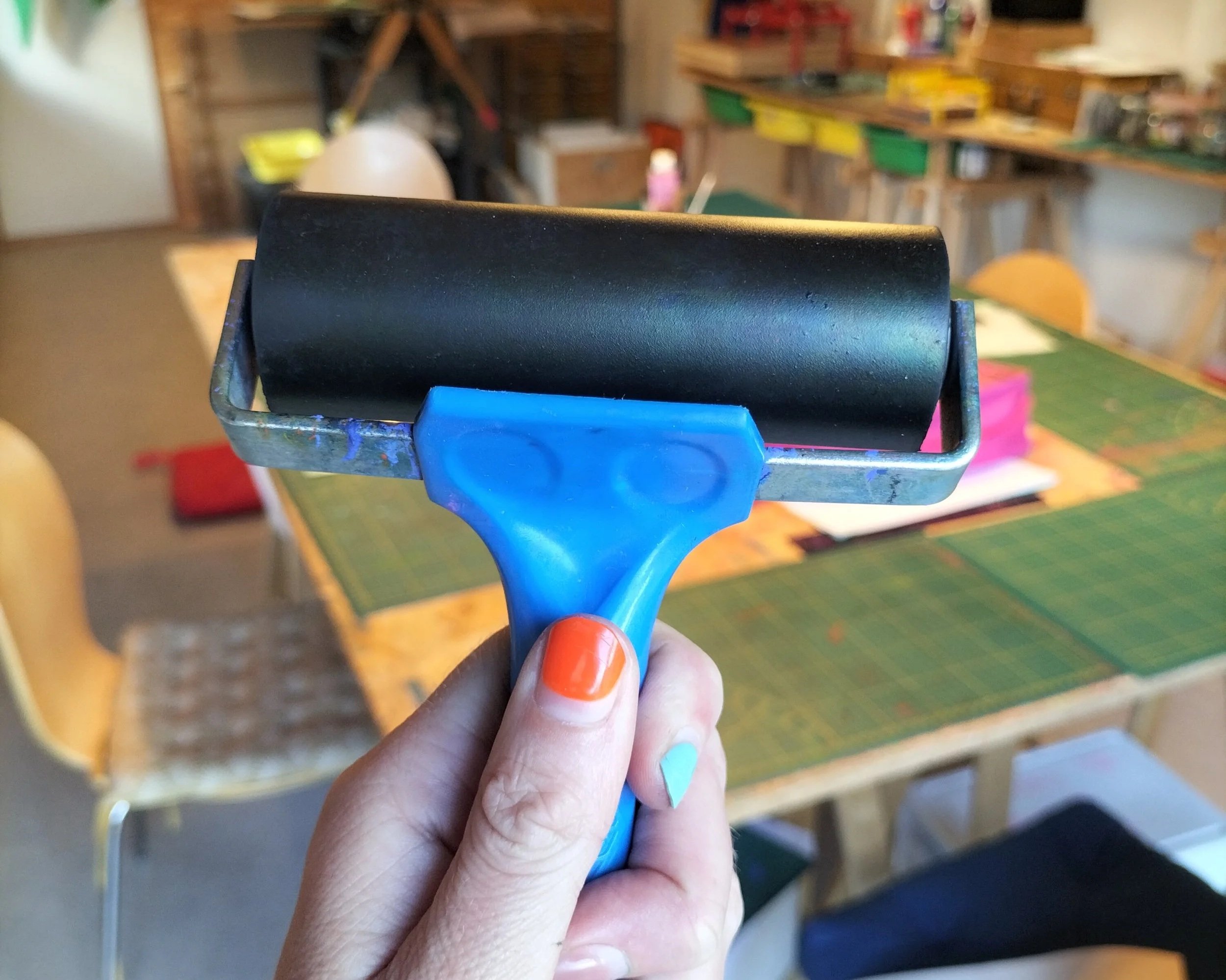 For inking, you'll need a good rubber roller, also called a brayer. I highly recommend the Essdee brand, preferably their blue or black rollers. They're by far the best in my opinion. For textile printing, you can use a foam roller.