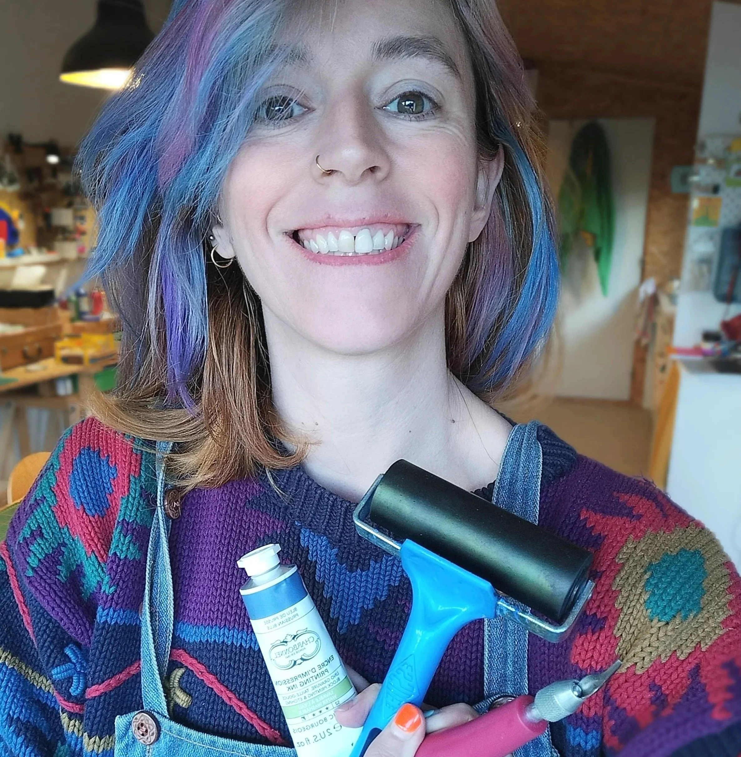 I have printmaking starter kits, with some carving tools, roller, ink sample, plates of lino, wood and rubber, barren, and a selection of paper available to sell at my studio or after my classes. Be in touch if you’re interested!